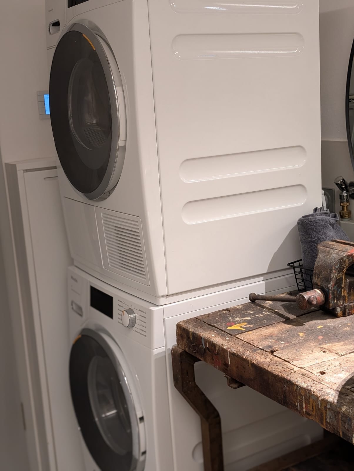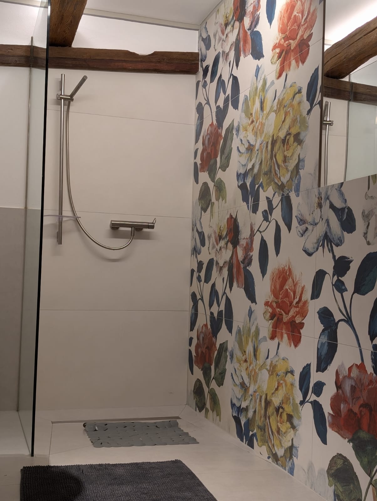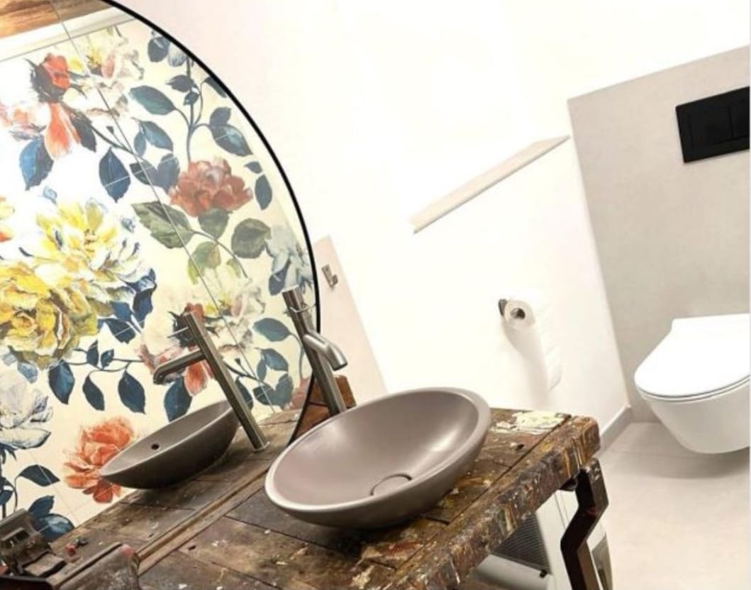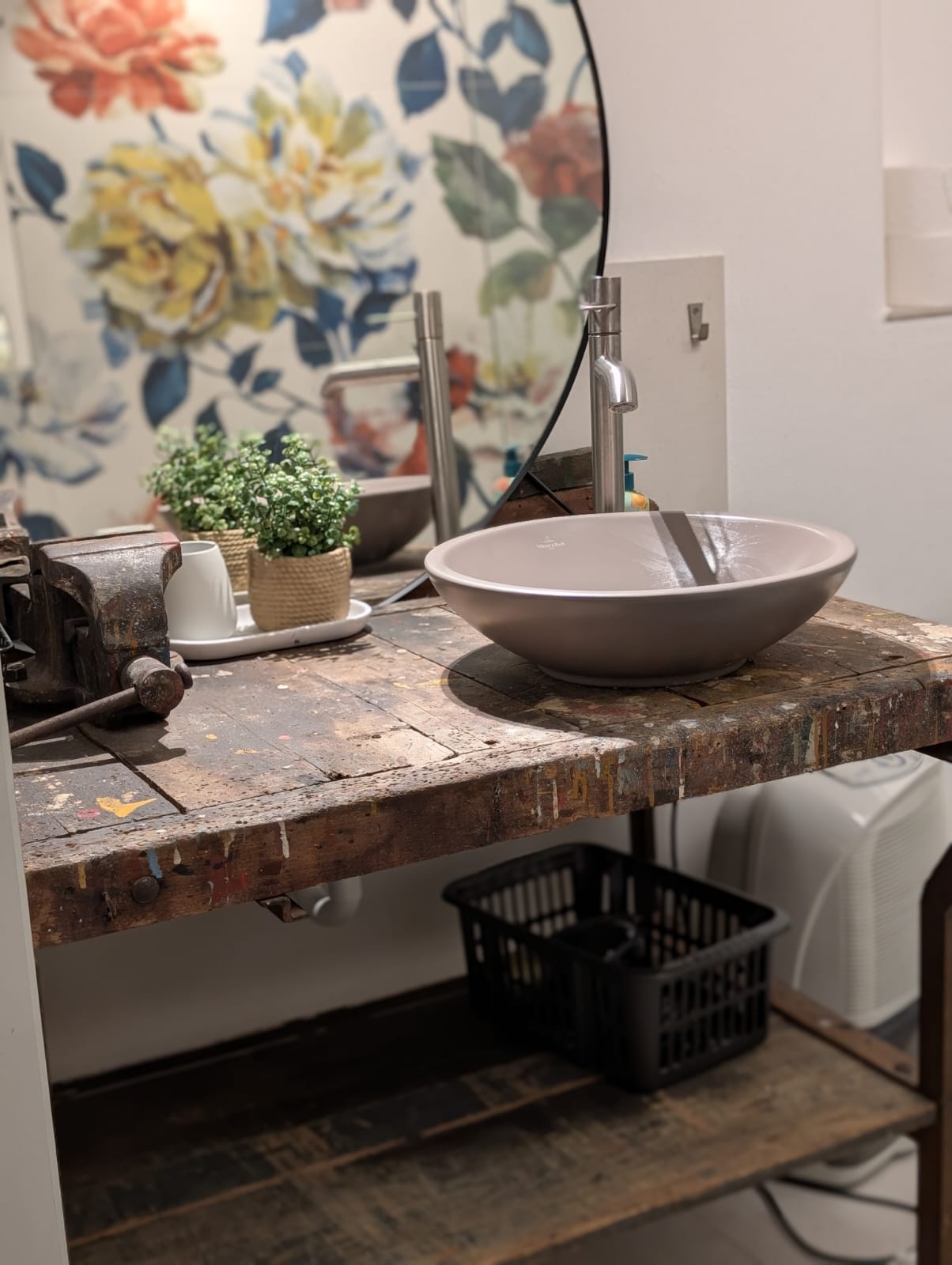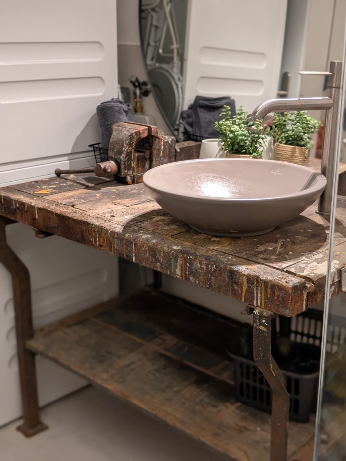 Das außergewöhnliche Badezimmer ist ein echtes Highlight der Wohnung: Der Waschtisch wurde aus einer alten Werkzeugbank gefertigt und aufwendig umgebaut, sodass er eine ganz besondere, individuelle Note bekommt. Die großzügige, ebenerdige offene Dusche lädt zu einem entspannten Duschvergnügen ein.