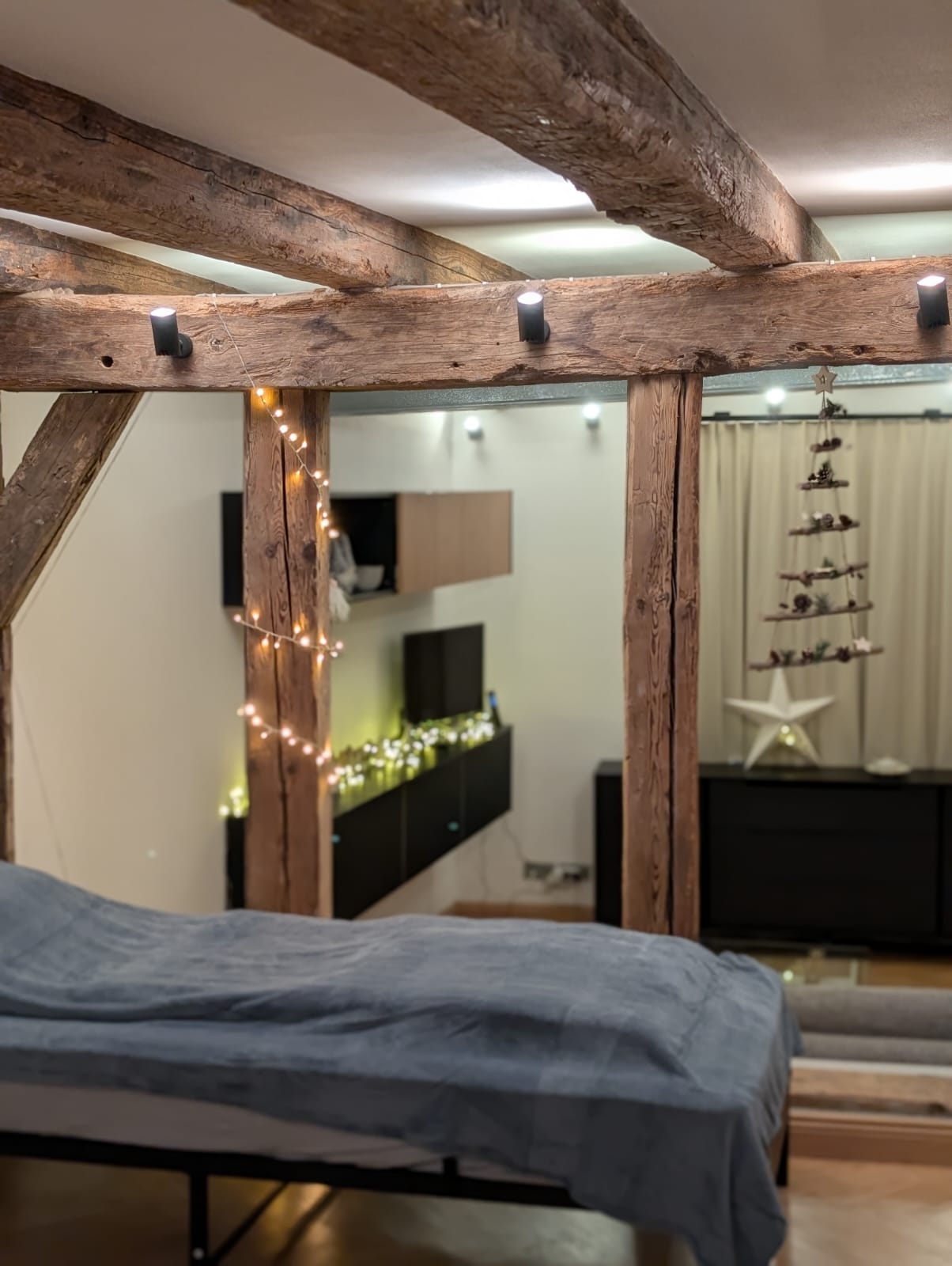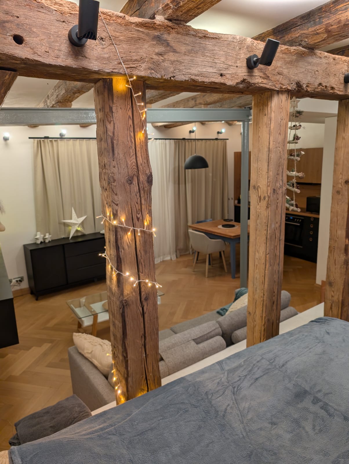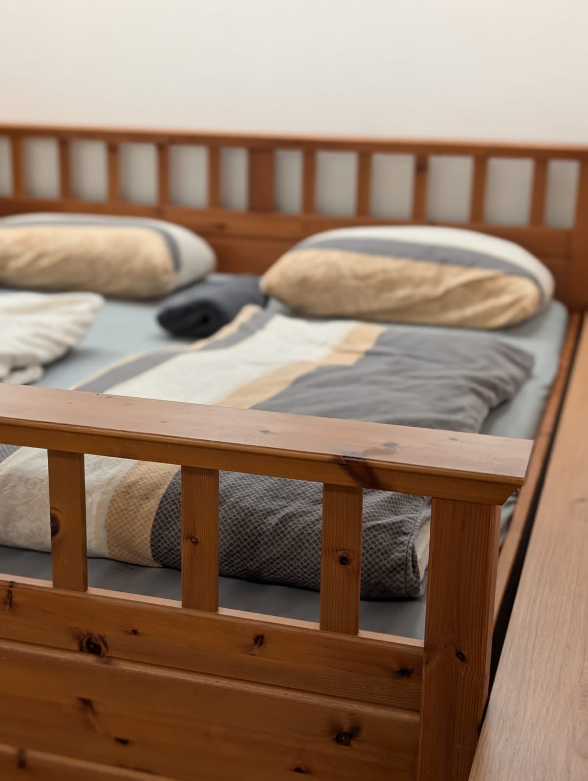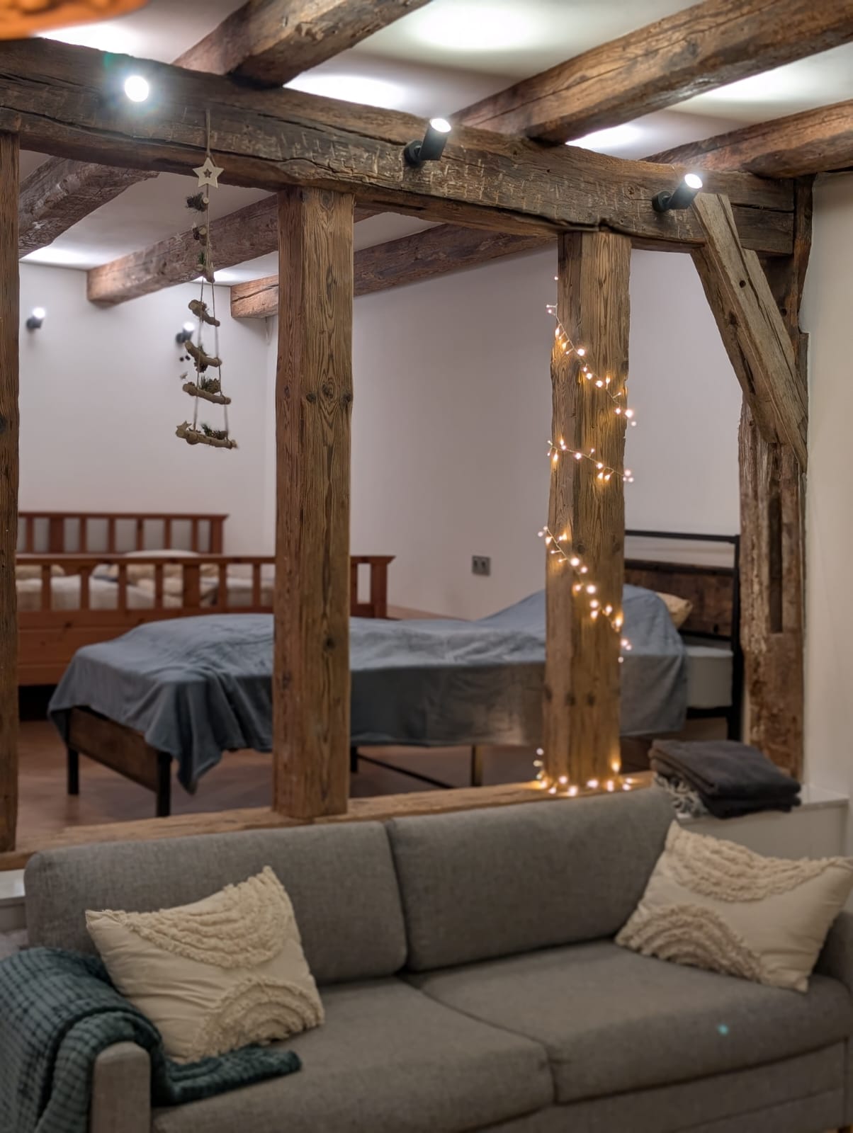 Die Wohnung ist offen geschnitten und besticht durch ihre luftige Atmosphäre. Der Schlafbereich ist mit einem großen, bequemen Doppelbett und einem Einzelbett ausgestattet. Im Wohnzimmer gibt es eine komfortable Schlafcouch mit echter Matratze, die zusätzlich Schlafmöglichkeiten bietet. Für Familien mit kleinen Kindern stellen wir auf Wunsch ein kostenfreies Reisebett zur Verfügung – Kinder sind bei uns herzlich willkommen!